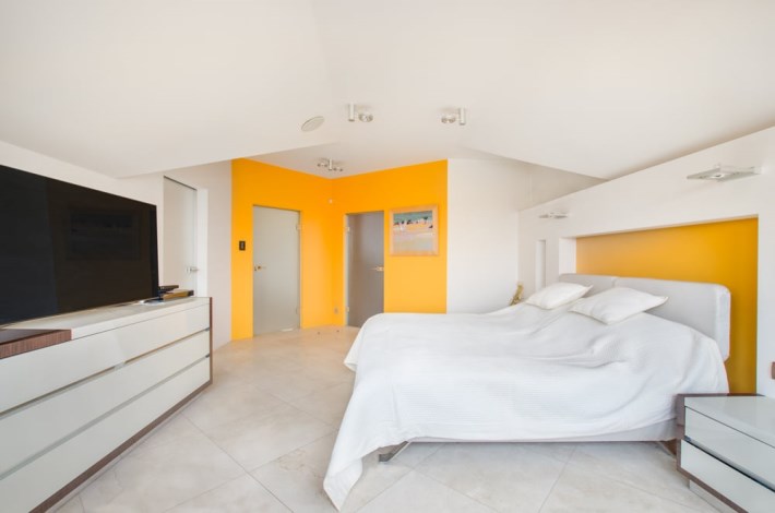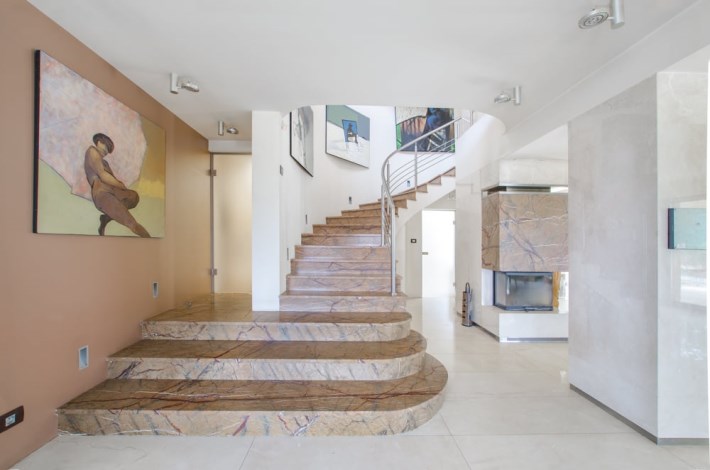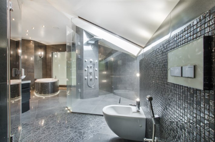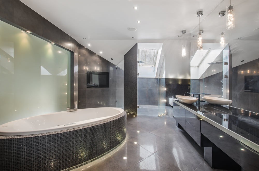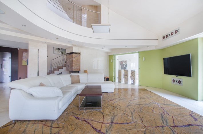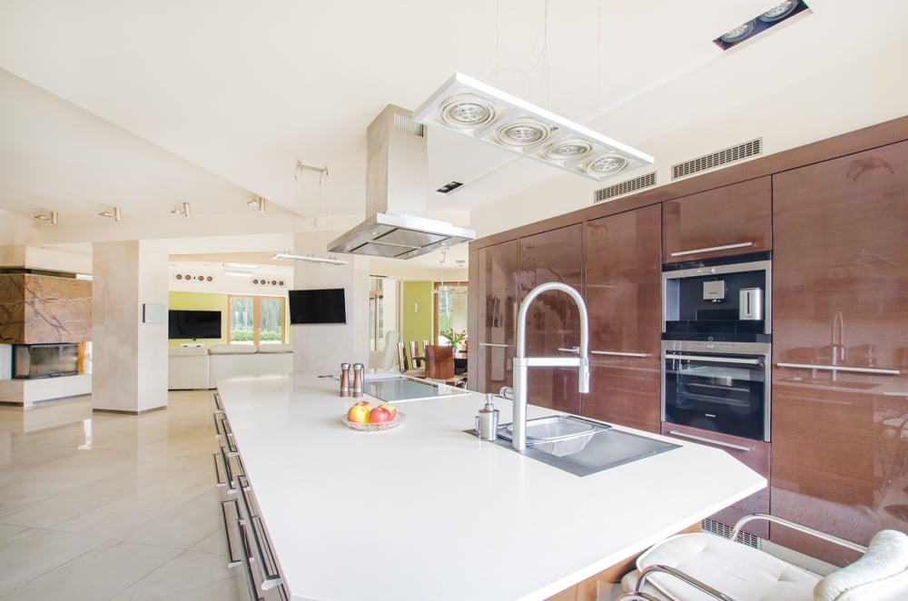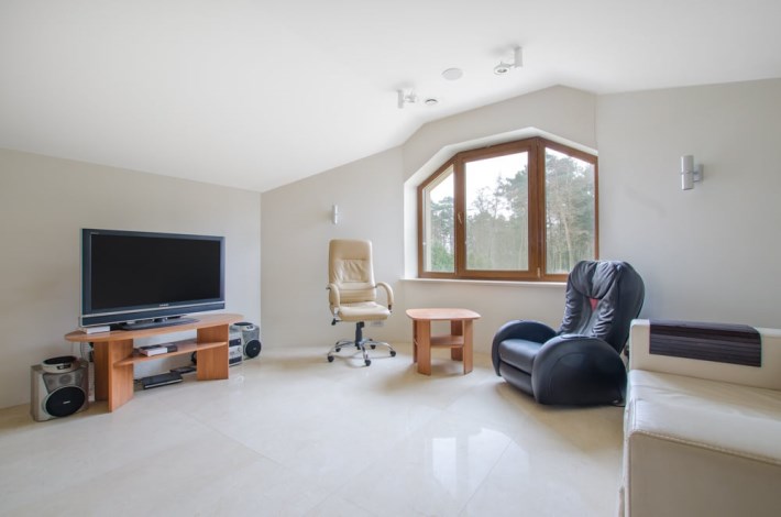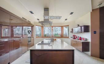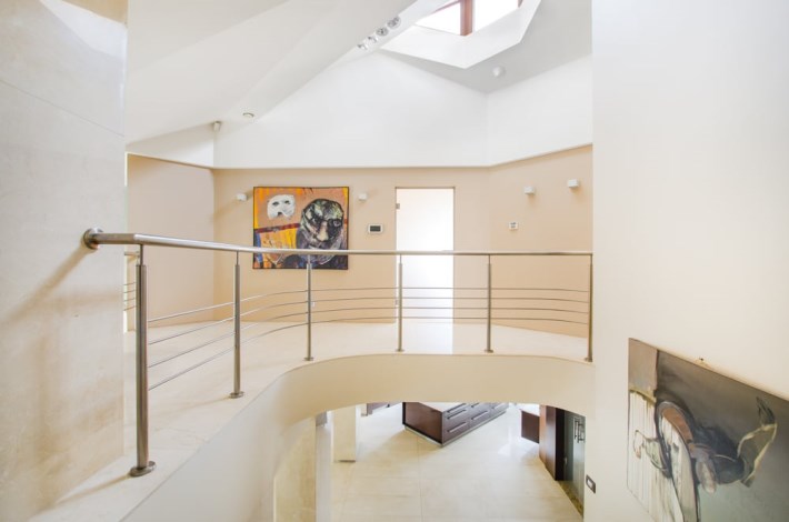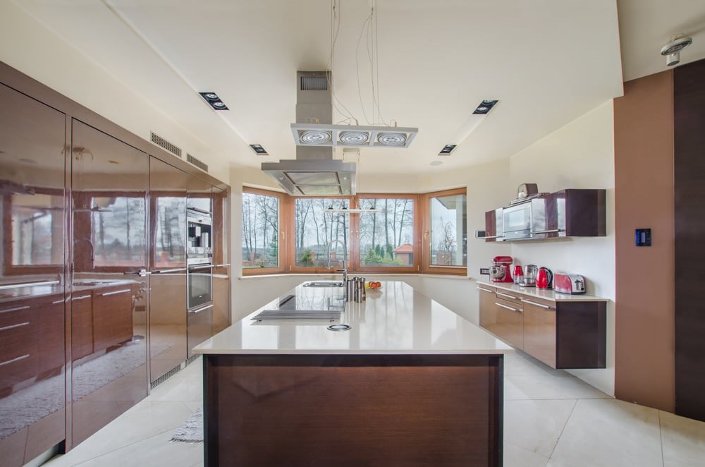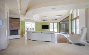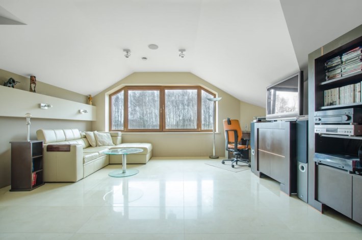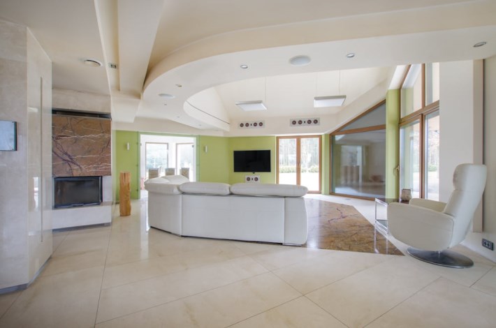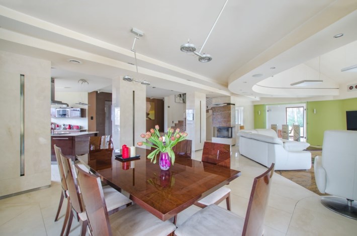 Dom obfituje w nowoczesne rozwiązania techniczne, jak rekuperacja, kino domowe z chowanym ekranem w suficie czy inteligentne zarządzanie w sumie wszystkim – muzyką, temperaturą, roletami, światłem itd.