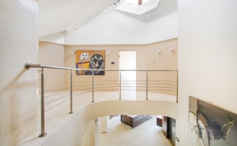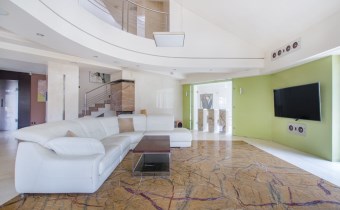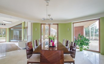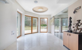 Przez olbrzymie okna od południa i zachodu, do salonu i jadalni niemalże wdziera się kojący widok otaczającej dom zieleni. Jasne barwy, dużo światła, wyszukana aranżacja, poczucie przestrzeni dzięki wysokiemu sufitowi i antresoli.