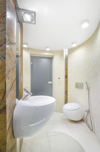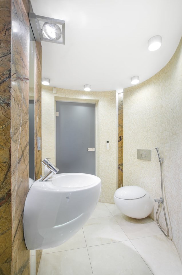Gościnna łazienka kryje także sekretne przejście do pralni z własnym, zasłoniętym dla ogólnego widoku tarasem, na którym swobodnie można suszyć wypraną garderobę.